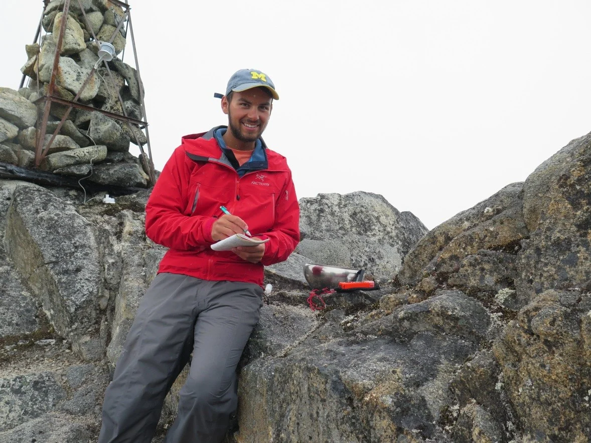 Author collecting rainwater samples at Camp-10. Photo by Blaire Slavin.