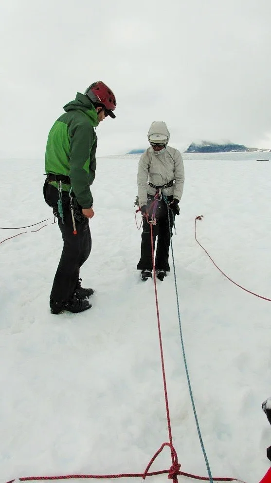 Ari tying her final safety knots with the crevasse opening several meters behind her. Photo by author.