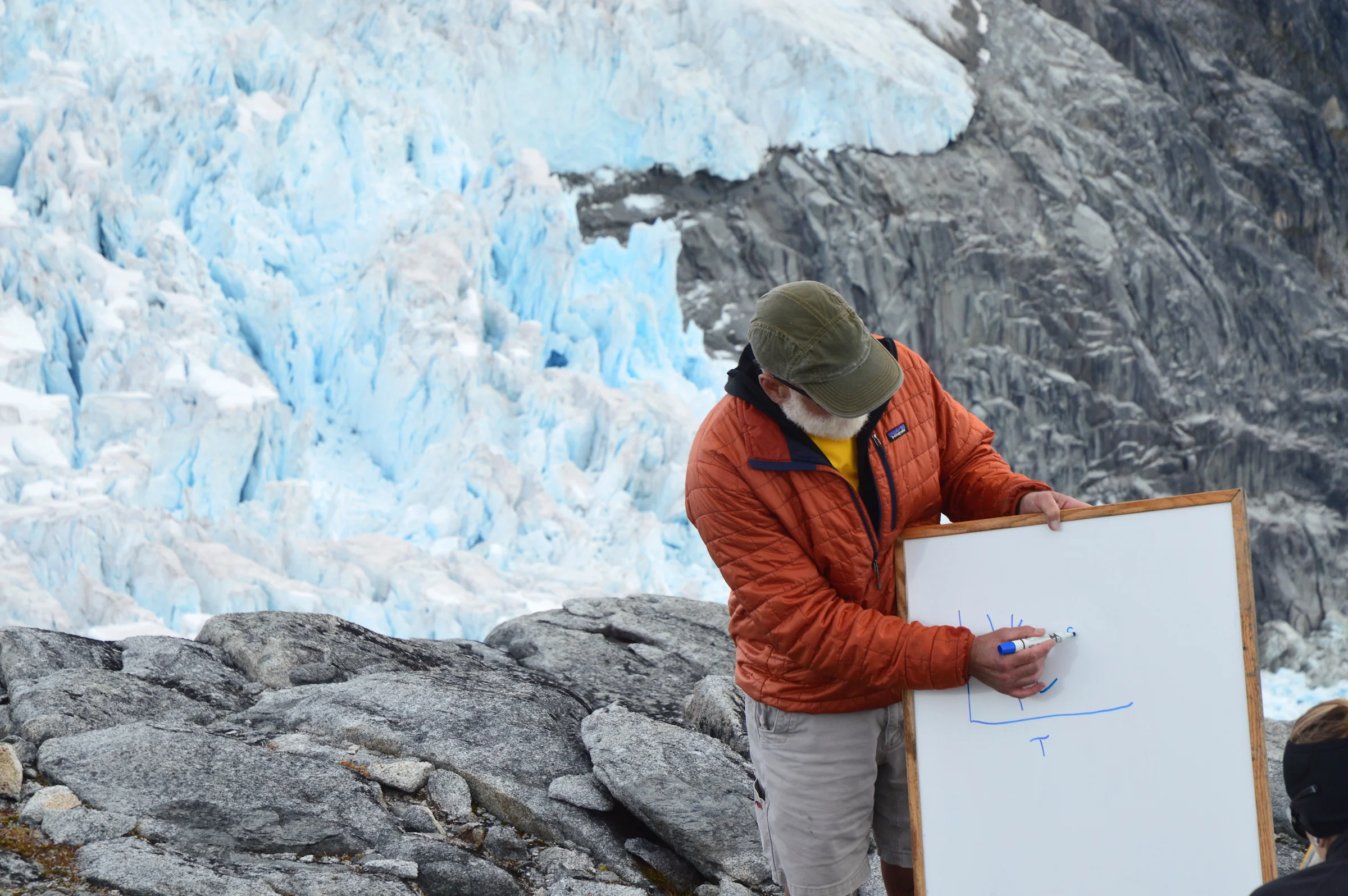 I was inspired by the constant interruption of our class discussion by ice falls from the Vaughn Lewis Glacier behind me. The subject was the physical properties of ice; go figure. And I was challenged by having to draw the phase diagram of water upside-down on a white board; without a net. Way out of my comfort zone.