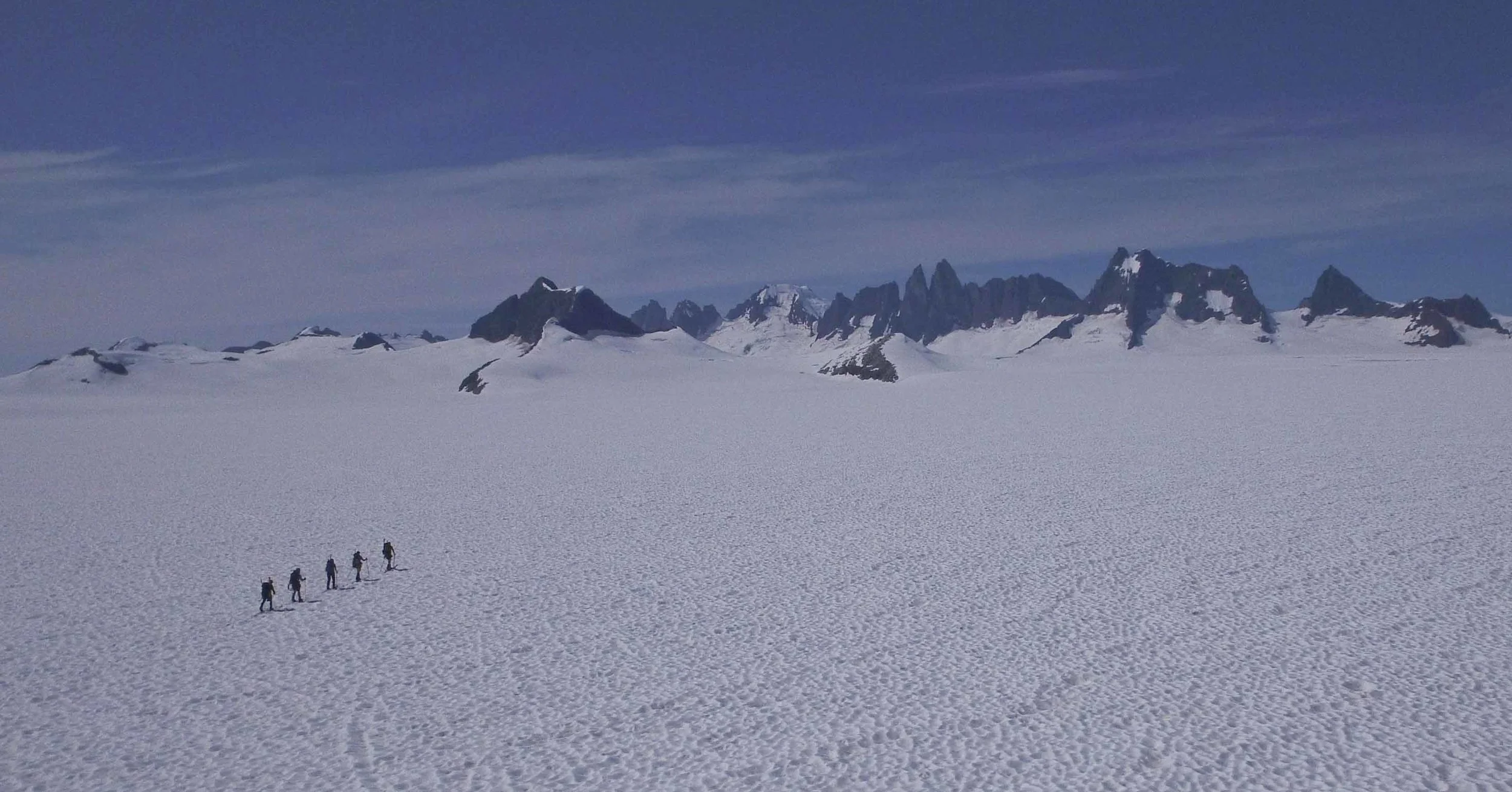 ". . . beneath all the ice, all nunataks are connected." A team of JIRPers crosses Taku Glacier. Photo by M. Beedle.
