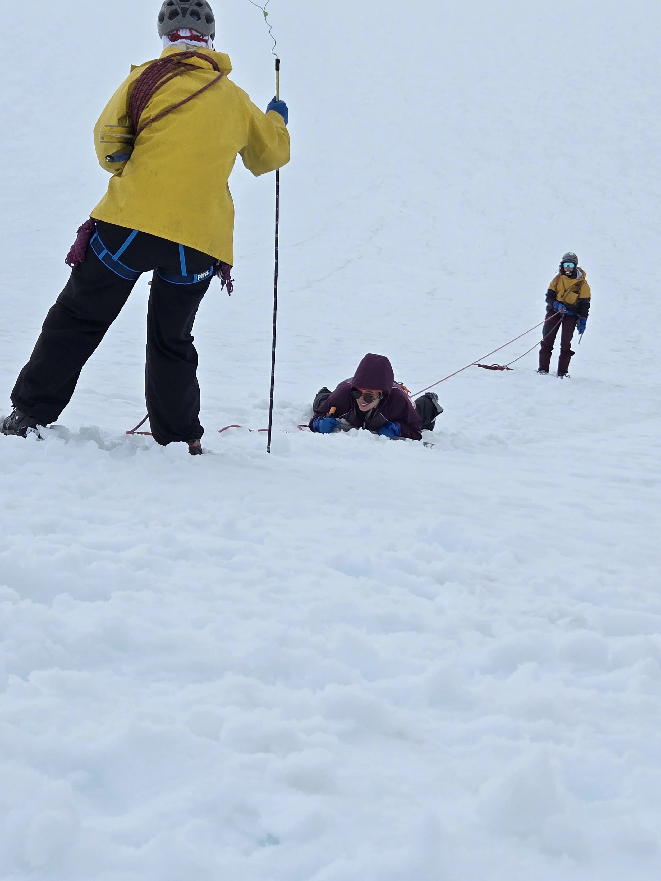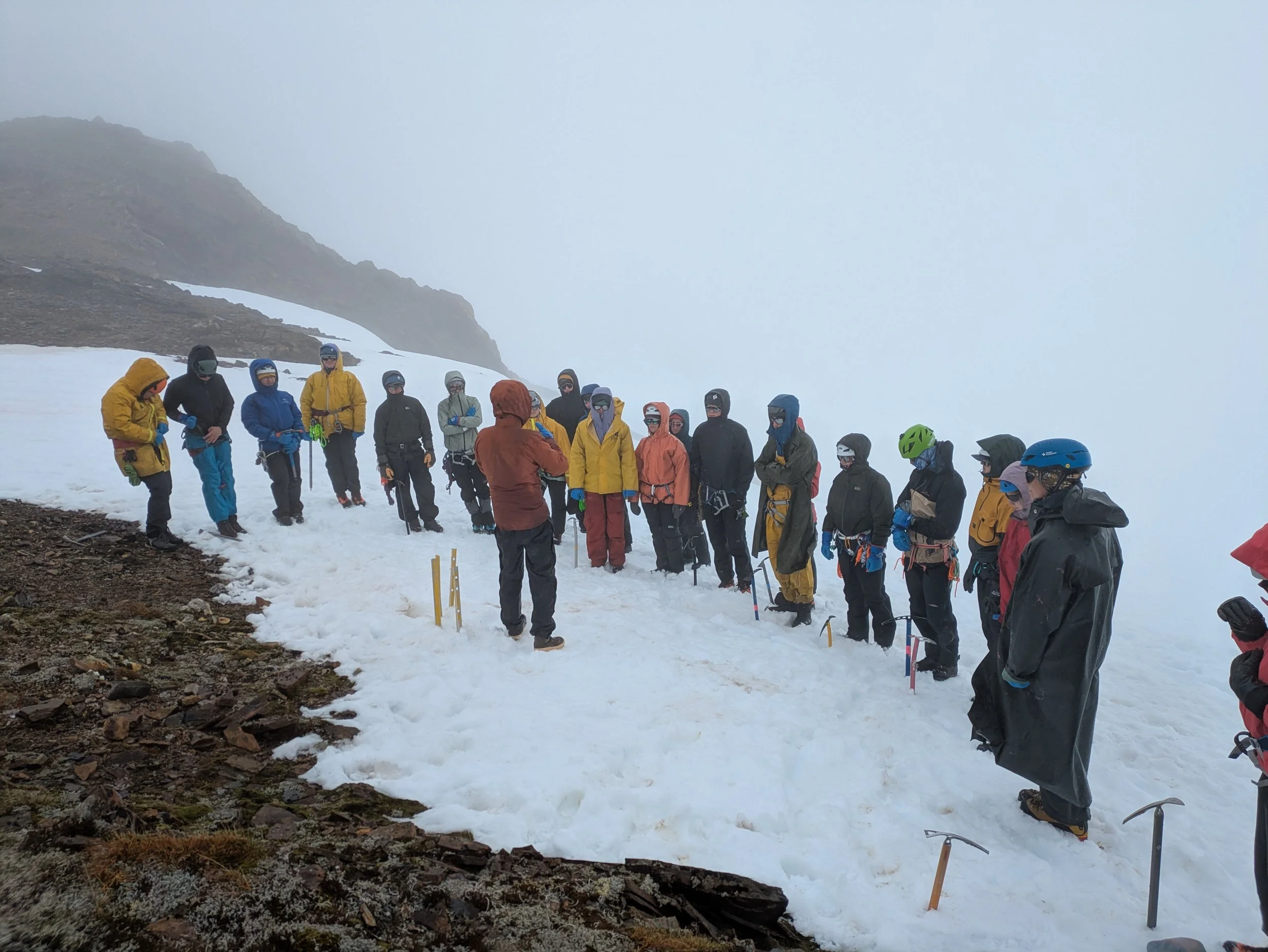 We spend as many hours as possible on the glacier every day so that everyone becomes accustomed to working in the sun, rain, wind, and fog, but we are almost always within a short, safe hike of camp. Using a combination of short lectures, group practice, and one-on-one mentorship, the staffers work with participants to develop basic mastery of all necessary skills.