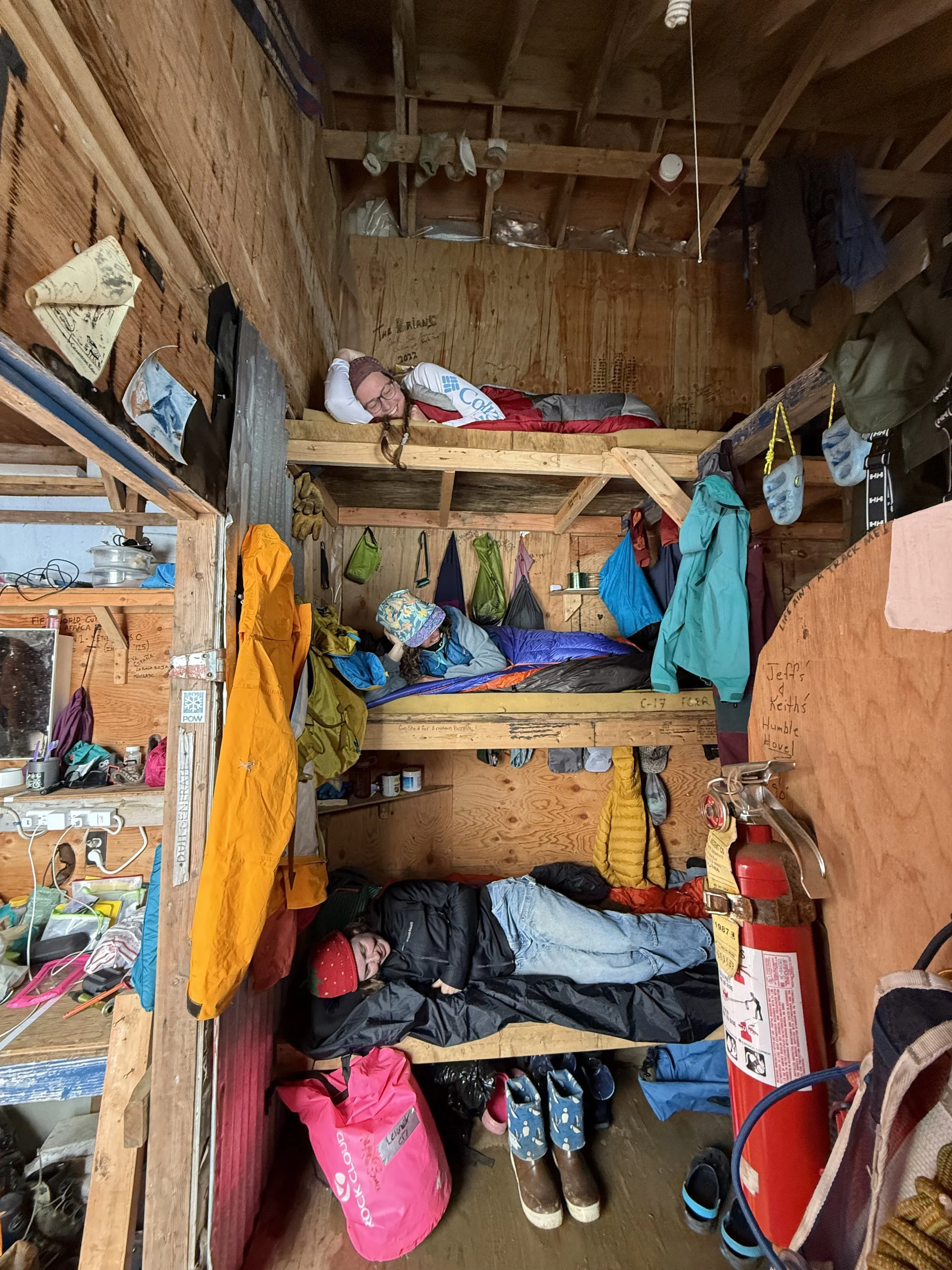 Personal space is limited in JIRP field camps. Bunkhouses are divided by faculty, staff, and students. Faculty and staff housing are gender-neutral; students can choose between single-gender and gender-neutral housing. Each person, regardless of the building in which they're sleeping, has roughly the same setup: A single bunk, a light foam mattress, and the storage space of either half the space under their bunk or hooks on the wall around their bunk. Because everyone brings a very limited selection of personal items to the Icefield this system generally works, but it does require that everyone is conscientious of their bunkmates.