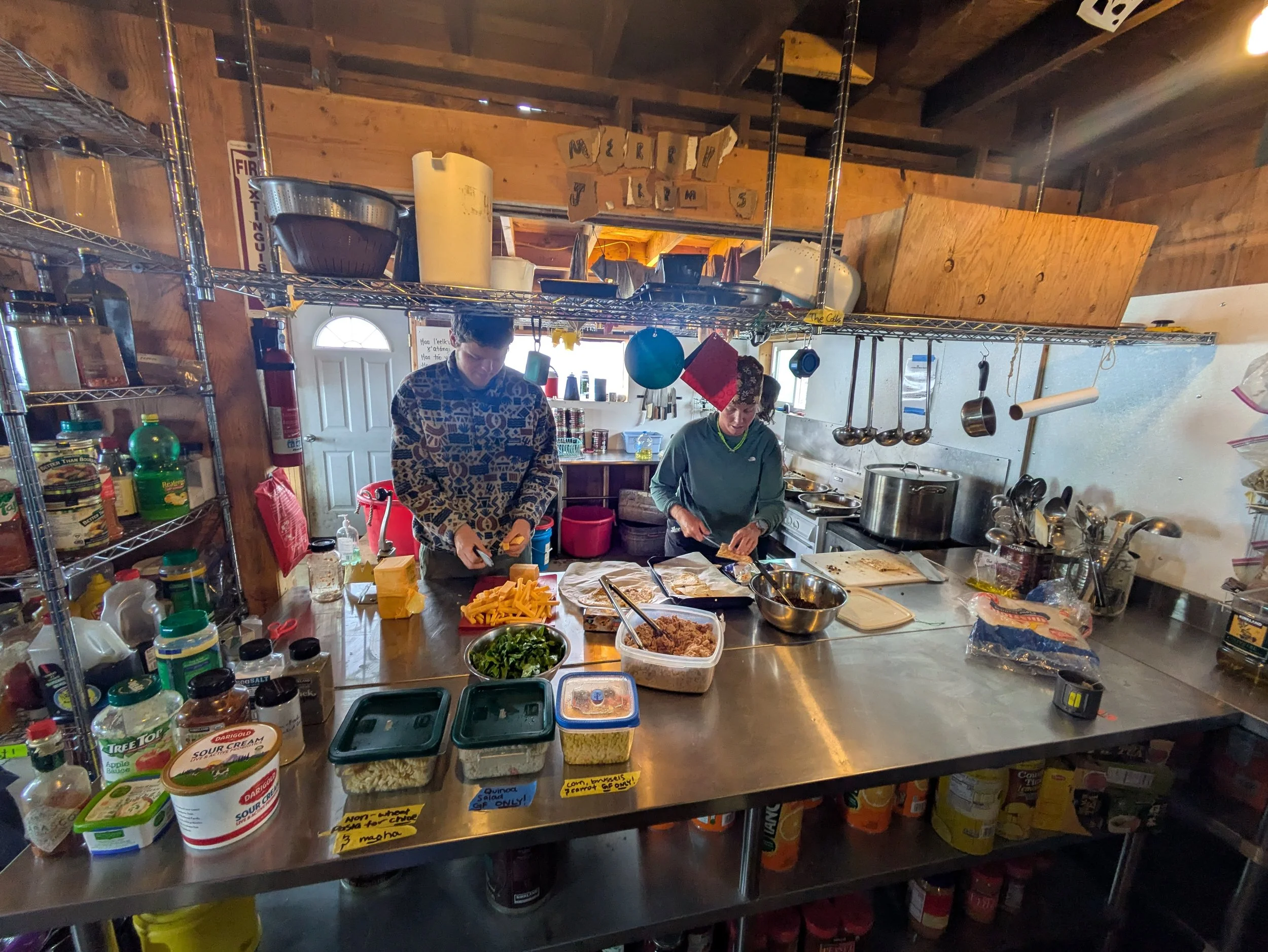 Dinner is up to the cooks, and we encourage the cooks to be creative! They have a pantry full of ingredients to choose from: Beans, rice, baking ingredients, canned and fresh vegetables, canned chicken/roast beef/tuna/SPAM, spices, pastas, tomato sauces, potatoes, and a variety of other things.