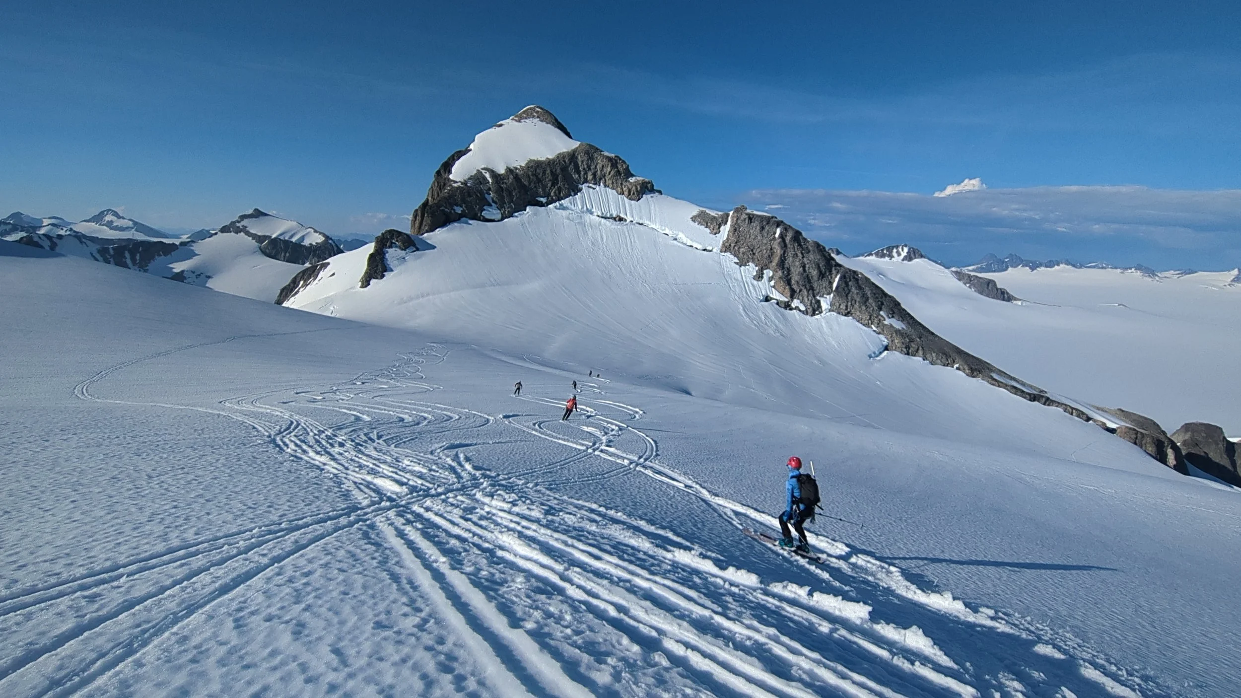 Temperatures during the field season will vary dramatically. Hot, sunny days can get up to 80 °F/25 °C. Believe us when we say that a sunny day at the beach will not feel as hot as cross-country skiing on a sunny day with the snow reflecting the sun back up at you. Exercising in the sun on a giant mirror is no joke! At night, temperatures can drop below freezing, but it likely won't ever get deeply cold. On clear nights we may see temperatures down to 20 °F/-5 °C, but it's rare for it to get much colder than that. Most days on the Icefield will probably be pretty moderate: 40-50 °F/5-10 °C and overcast or drizzling.